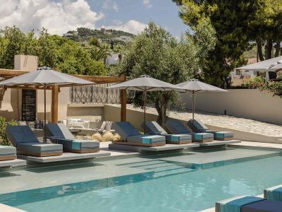 In an enviable location next to the sea, this villa boasts its own pathway and steps down to Makris Yialos beach with its turquoise waters.